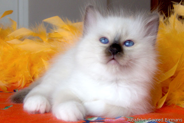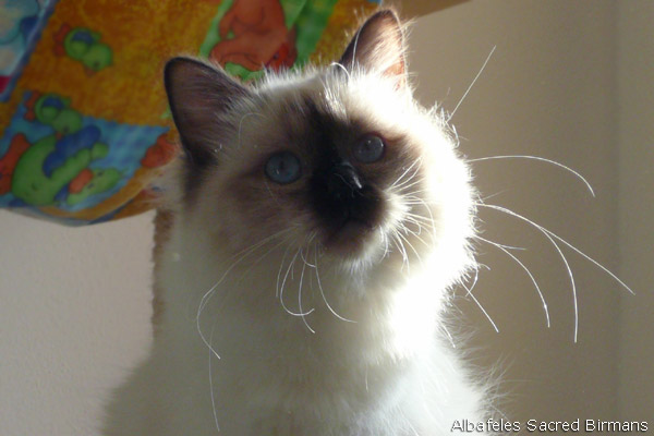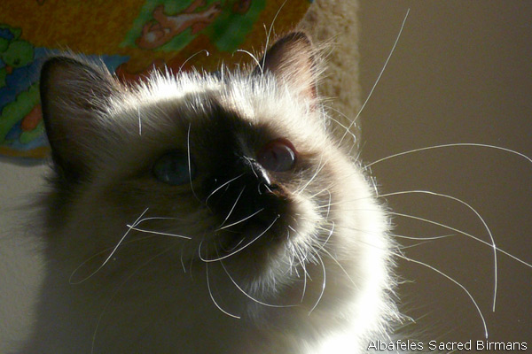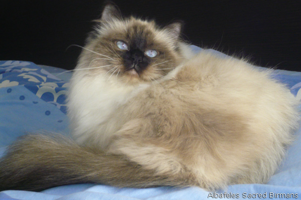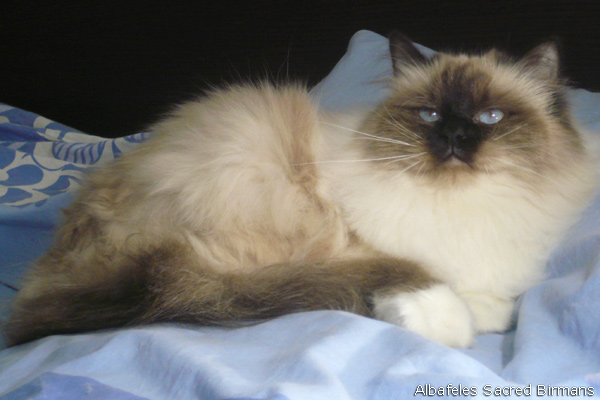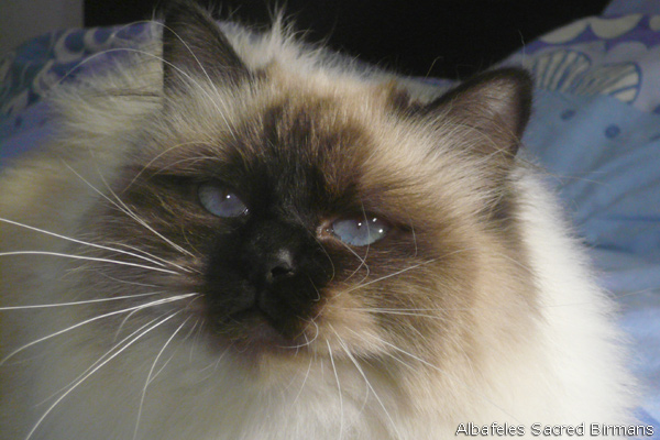 Albafeles' Nympha is a seal-point birman, she has inherited from her mather: deep blue eyes; strong structure; silky coat and lovely temperament. She has inherited from her father: excellente profile and consistent coat.